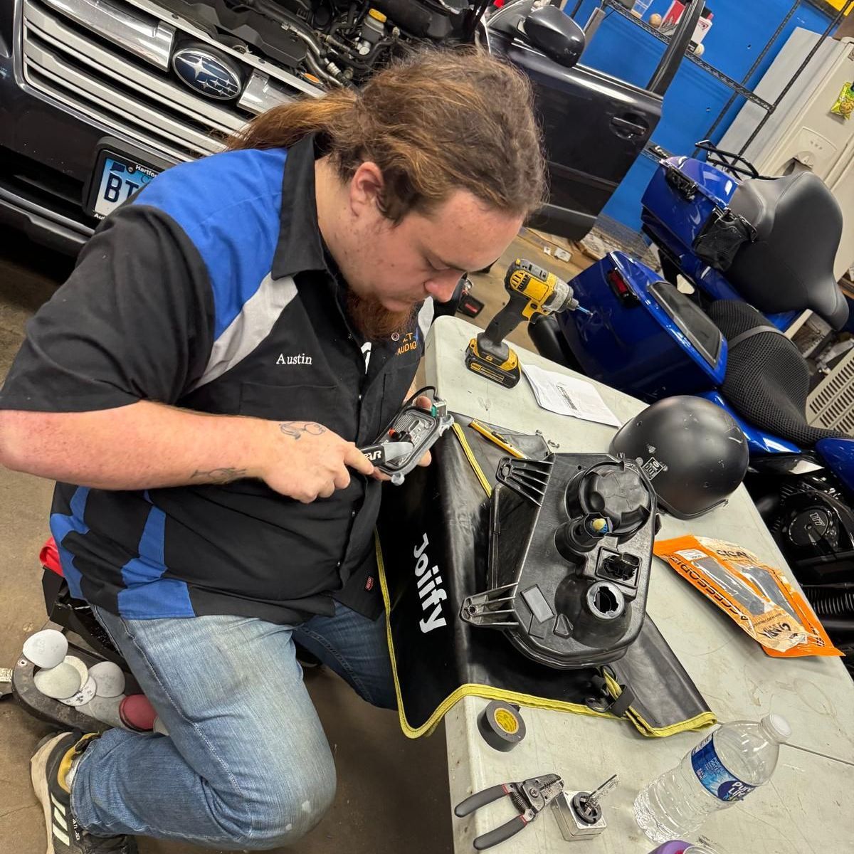 school as a breathalyzer technician, learning as much as I could while continuing my education. I made my way up to the 12 Volt technician position soon after I graduated in 2020 as well as becoming MECP certified, and then took a course to become a certified detailer. I’ve always had a passion for cars and wanted to pursue a career in the automotive industry. Another passion of mine is motorcycles and motorcycle audio. After the first motorcycle system I did here at the shop, I knew I wanted to focus as much time as I could into learning more about motorcycle audio systems. One of my main goals in life is to own my own motorcycle with the kind of systems I love installing so I can enjoy it for myself.